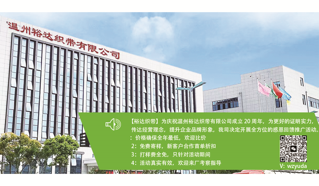是一家集研發、生產、銷售各種織帶制品的專業性企業。主要產品包括:各式 無紡布提手帶、尼龍織帶、提花織帶、松緊帶、包邊帶、寵物帶、禮品掛帶、腰 帶、寵物用品帶、工業捆綁帶、吊裝帶、手機吊帶等多種產品系例。是眾多國際品 牌的戰略合作伙伴,產品覆蓋全國并出口世界。